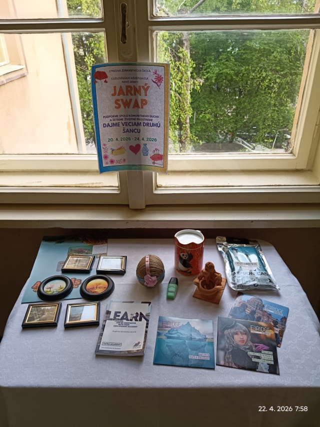 Na našej škole sa uskutočnil jarný SWAP, ktorý prebiehal počas celého týždňa od 20. 4. 2026 do 24. 4. 2026. Na chodbe bol pripravený jeden spoločný stôl, kde mohli žiaci aj učitelia prinášať veci, ktoré už nepotrebujú, a zároveň si odtiaľ vziať niečo iné. Výmena prebiehala kedykoľvek počas dňa, takže sa do nej mohli zapojiť všetci podľa vlastného času. Podujatie podporilo myšlienku udržateľnosti a znovupoužitia vecí. Počas týždňa sa na stole vystriedalo množstvo zaujímavých predmetov. Žiaci ocenili najmä voľnosť a jednoduchý princíp celej akcie. SWAP priniesol do školy príjemnú atmosféru a záujem o podobné aktivity do budúcna.